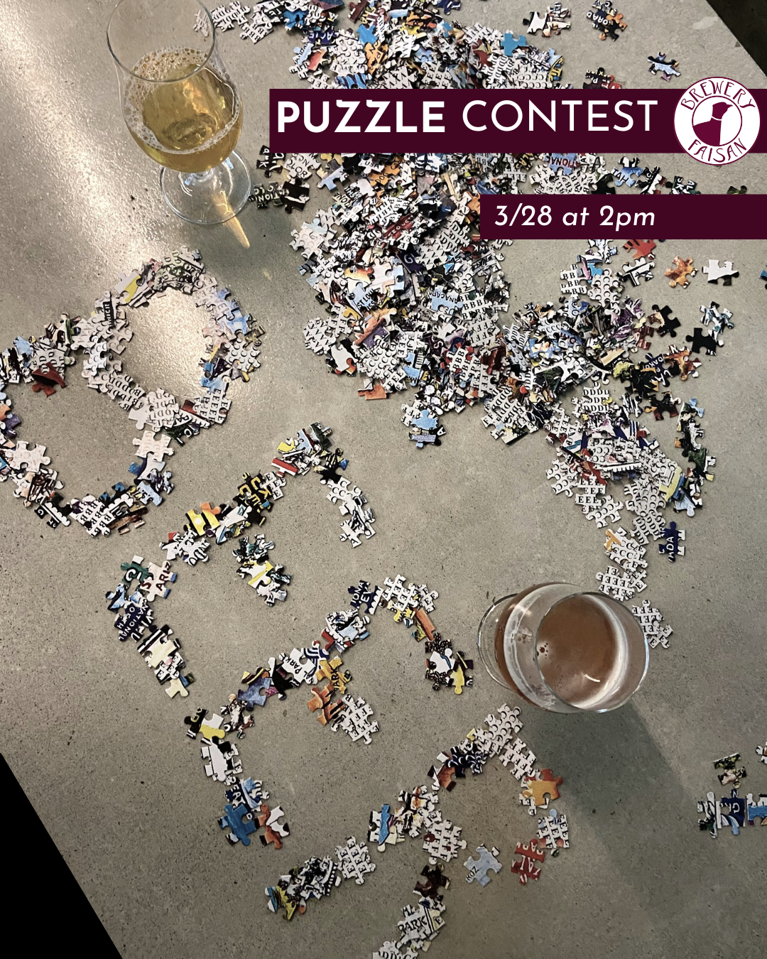 Get yourself a puzzling partner because the contest will take place in teams of 2. Each team will receive the same 500-piece puzzle, unopened in its original box. At 3pm, we’ll say ready set go, and you’ll be off to the races! First team to complete the full puzzle wins bragging rights, a new 1500-piece puzzle to take home, and a $10 Brewery Faisan gift certificate. Every participating team gets to take home their 500-piece contest puzzle.